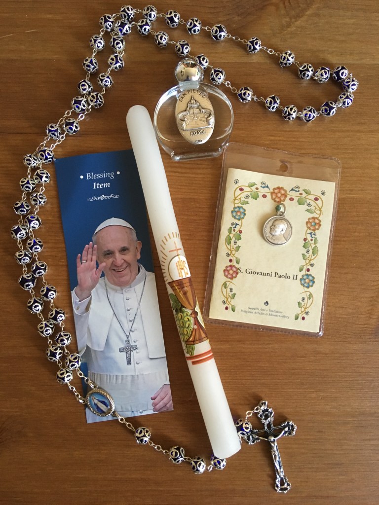 After whizzing through the galleries and St. Peter’s Square, we of course were ferried past a gift shop where we’d have some time to buy trinkets and eat some lunch before the group would be taken by bus to the Colosseum. I picked up rosaries and holy water and candles, then shuffled over with my boyfriend and his father to what was basically a glorified cafeteria.