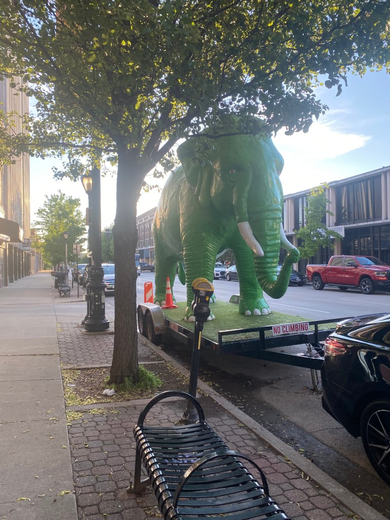 Brian had to give a paper at a small academic conference in Springfield, Illinois, earlier this summer, so I tagged along with him for a quick overnight trip. Once the academic portion of the first day was complete, we zoomed off campus to try to get to Dumb Records before they closed. We figured that, in the spirit of adventure, as long as we got ourselves to the cool little indie record shop, there would most likely be plenty of other fun stuff to do in the vicinity. Well, the joke was on us because the area was pretty much a ghost town by the time we got there. But the record store itself (including their big, bright green elephant mascot out front) was fantastic.